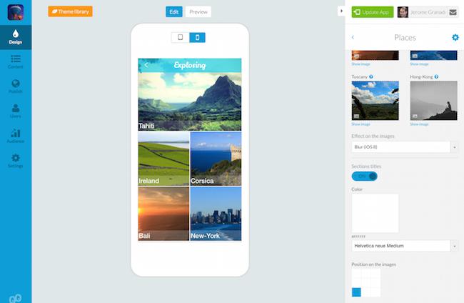 First of all, you must choose a template. Consider each template as a launcher to open the sections included in Menu. Depending on the style you want to give to your "launcher", you will go for a template where you upload your own images (as in the example above), or use colors and icons (example below).