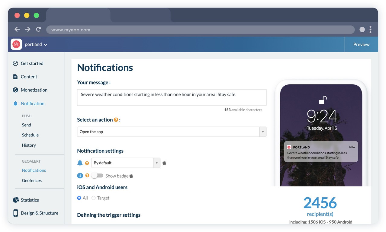 For each geofence and in keeping with the target settings, create a message and define a delivery strategy while using your app.